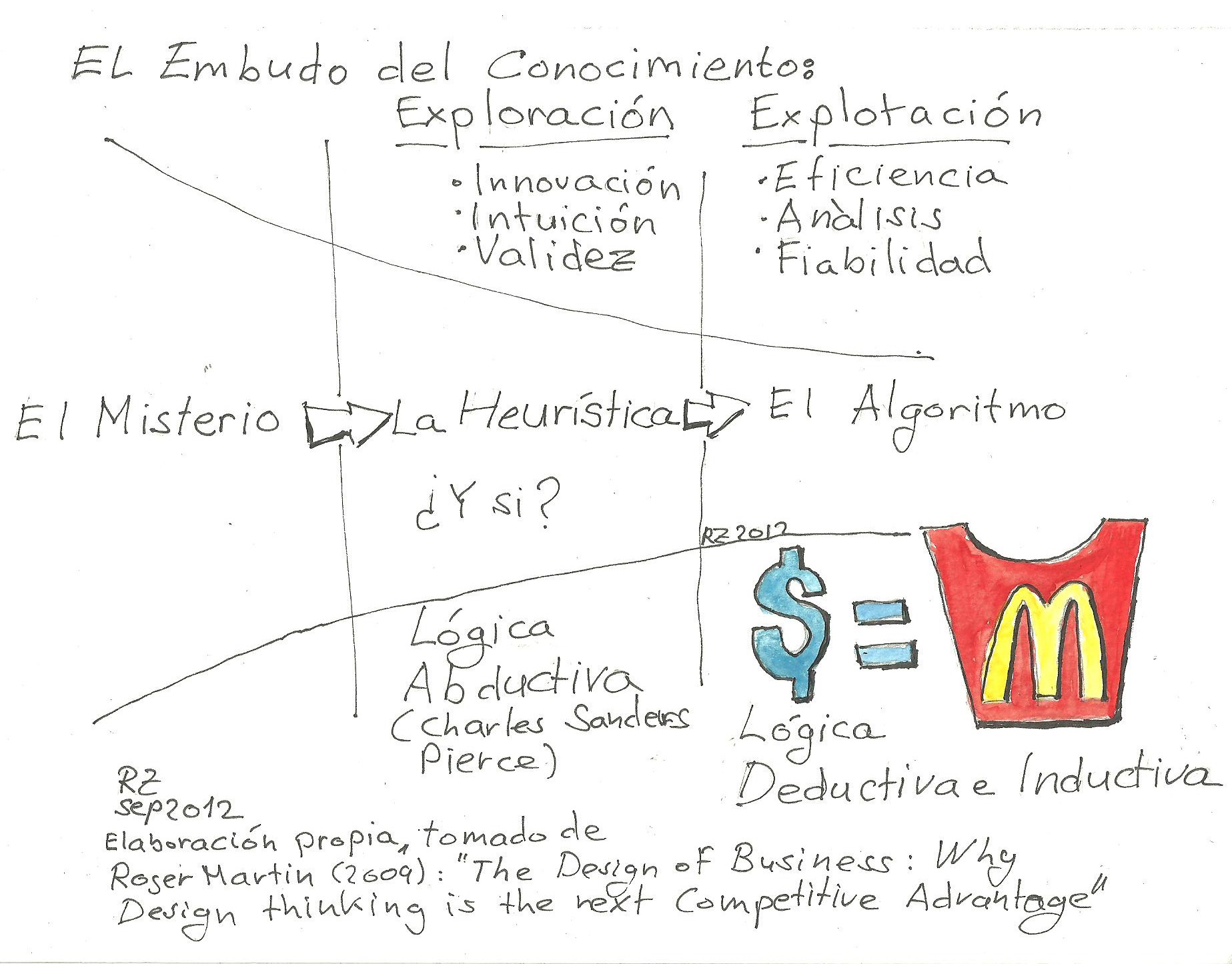 Según Martin, en este campo, lo fundamental en la heurística es el acierto para poder continuar experimentando. La contrapartida de la heurística en computación es el algoritmo. El funcionamiento de un negocio es más parecido a un algoritmo, donde lo que se pretende es que “rule”. En él, a pesar de que los directivos sepamos cómo éstos funcionan, la información no siempre es fiable, ni está estructurada, ni completa, por lo que lo difícil acertar. Se requiere, por consiguiente, una buena capacidad de análisis inductivo y deductivo. No se plantea acertar siempre, porque es imposible, sino de ser fiable. La innovación y el negocio se mueven pues en campos con lógicas diferentes. Dice Roger Martin: “El problema es que las personas que se guían por la validez ponen muy nerviosas a las que buscan la fiabilidad, y las guiadas por la fiabilidad deprimen un montón a la gente conducida por la validez”. Las diferencias entre ambas actividades son claras, y esto también se traduce en sus estructuras habitualmente más mecanicistas y burocráticas en el algoritmo del negocio, frente a sistemas más orgánicos en la heurística.