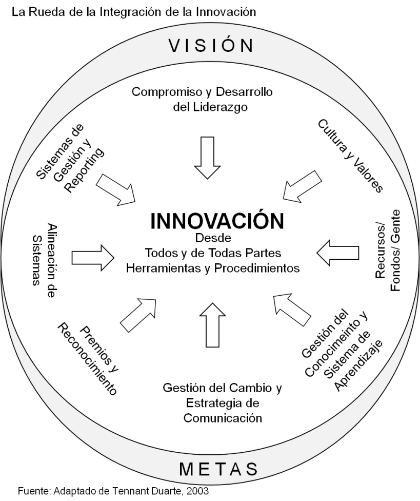 La incorporación de la innovación en Whirlpool supuso un cambio en toda la organización, integrando una nueva organización en la primera con una nueva cultura, valores, estructura, procesos, conocimiento, etc.. La figura 1 representa lo que en Whirlpool llamaron la “rueda de la integración de la innovación”.
