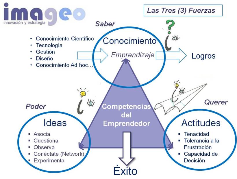 ¿Cómo llevar a cabo un proyecto con medios que no se controlan y consecuentemente con objetivos o resultados inciertos? ¿Qué competencias debe tener un emprendedor para ello? Quizás estas sean preguntas que nos hacemos todos los que nos dedicamos a apoyar proyectos de emprendimiento y, de una manera u otra, formamos a sus líderes para que lo hagan mejor. Si abordáramos esto con el planteamiento clásico y sencillo de la tríada de competencias: conocimientos (saber), destrezas y habilidades (poder o saber hacer), y actitudes (querer), en una primera aproximación, podemos llegar a un perfil de competencias similar al de un directivo con un componente importante, o una acentuada capacidad de liderazgo. Una de las características más relevantes del liderazgo, si no la más, es la capacidad de desarrollar y transmitir una visión. Sin duda, esto requiere imaginación que, por cierto, mantiene la misma raíz que imagen (sinónimo de visión), y es un recurso necesario para la creatividad. Sin embargo, mucho nos tememos que las condiciones de incertidumbre, inestabilidad, aprendizaje y descubrimiento, propias del proceso de emprendimiento (emprendizaje), conllevan un cambio continuo en los escenarios, que requiere soluciones y nuevas visiones a cada momento, mucho más allá de lo que ocurre en posiciones directivas de empresas con velocidad de crucero. Las destrezas creativas que ello implica asegurarán el avance del proyecto tanto en sus aspectos técnicos y de gestión como en los motivacionales. Nos encontramos pues con que las competencias creativas del emprendedor refuerzan directamente su capacidad de liderazgo.